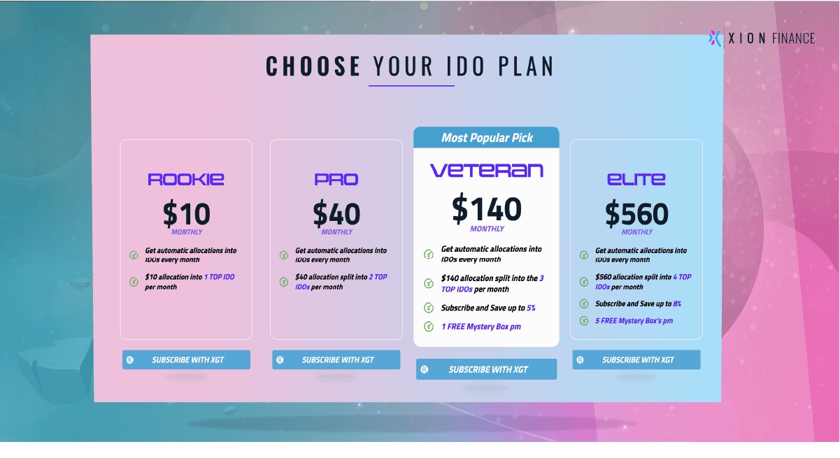 Every monthly plan will take the amount you paid in XGT to subscribe and it will be split into the TOP IDOs on Xion Finance per month. The higher the plan the more IDOs & bonuses you get.