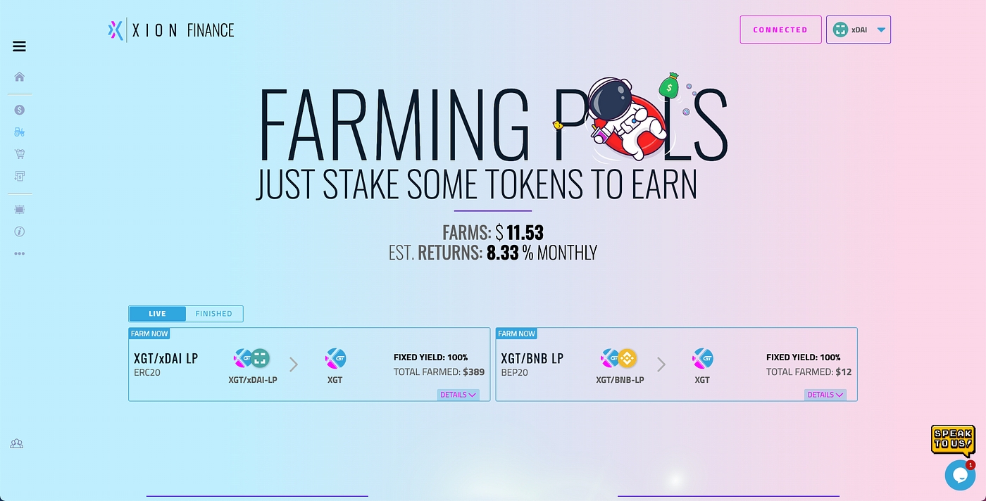 The XGT/xDAI and XGT/BNB LP tokens can now be staked on Xion Finance’s farming pool page for a fixed 100% APY. This means, anyone currently holding XGT/xDAI and XGT/BNB LP tokens will have to stake their LP tokens to continue earning XGT APY.